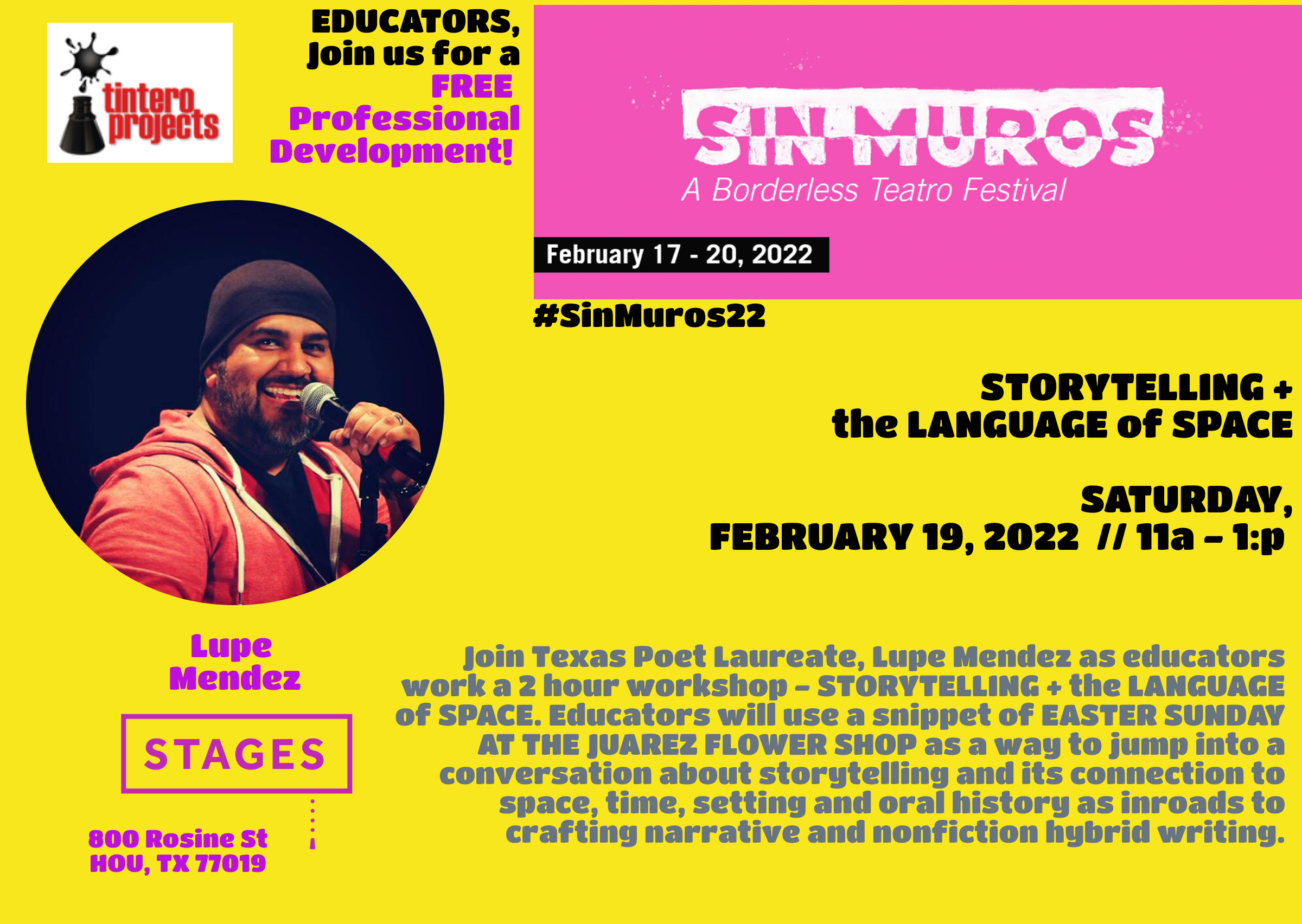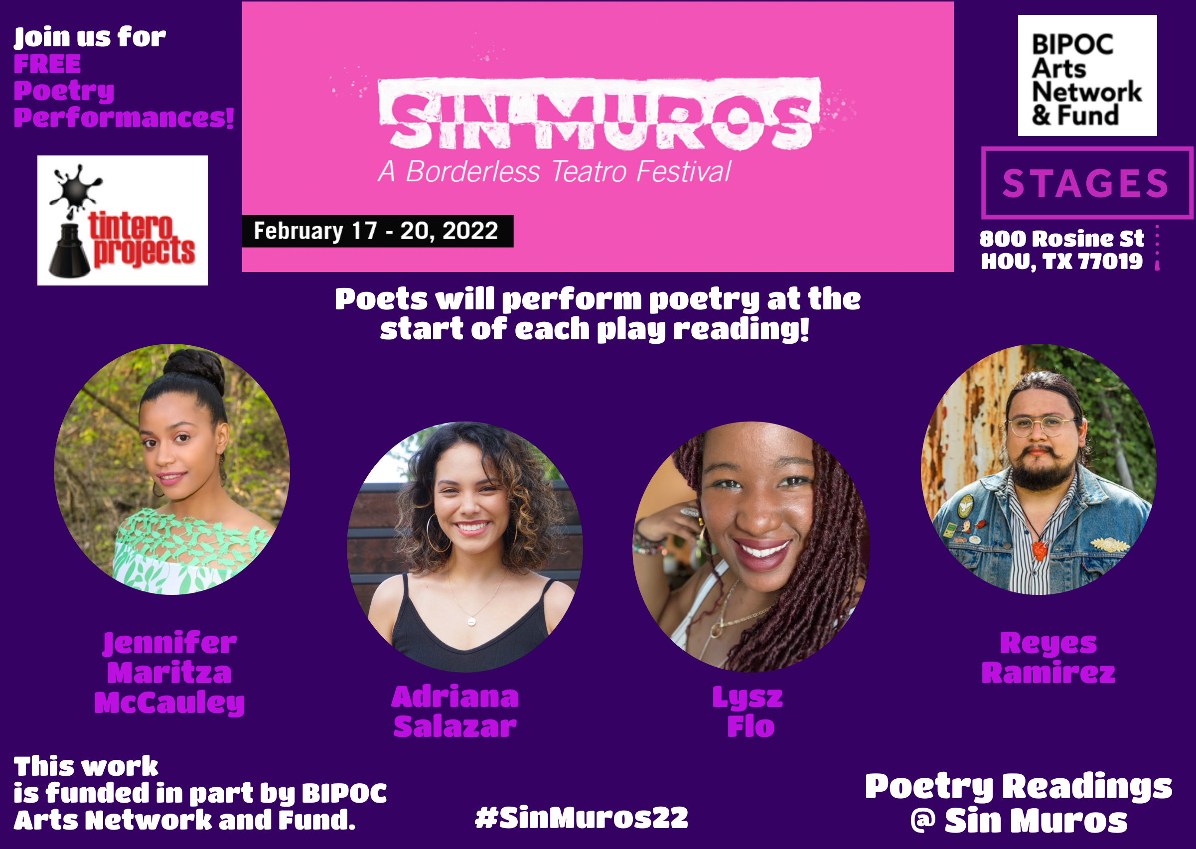 Every February, Stages celebrates the range of Latinx voices and stories reflecting the diversity of local Texas communities. The 3rd annual Sin Muros Latinx Theatre Festival will happen this February. Tintero Projects is a co - organizing partner focusing on providing poetry and a literary fair during the weekend festival. Poetry readings occur daily in-between staged readings. The festival weekend will be filled with public events for audiences and local theatre-makers, including workshops and networking opportunities.